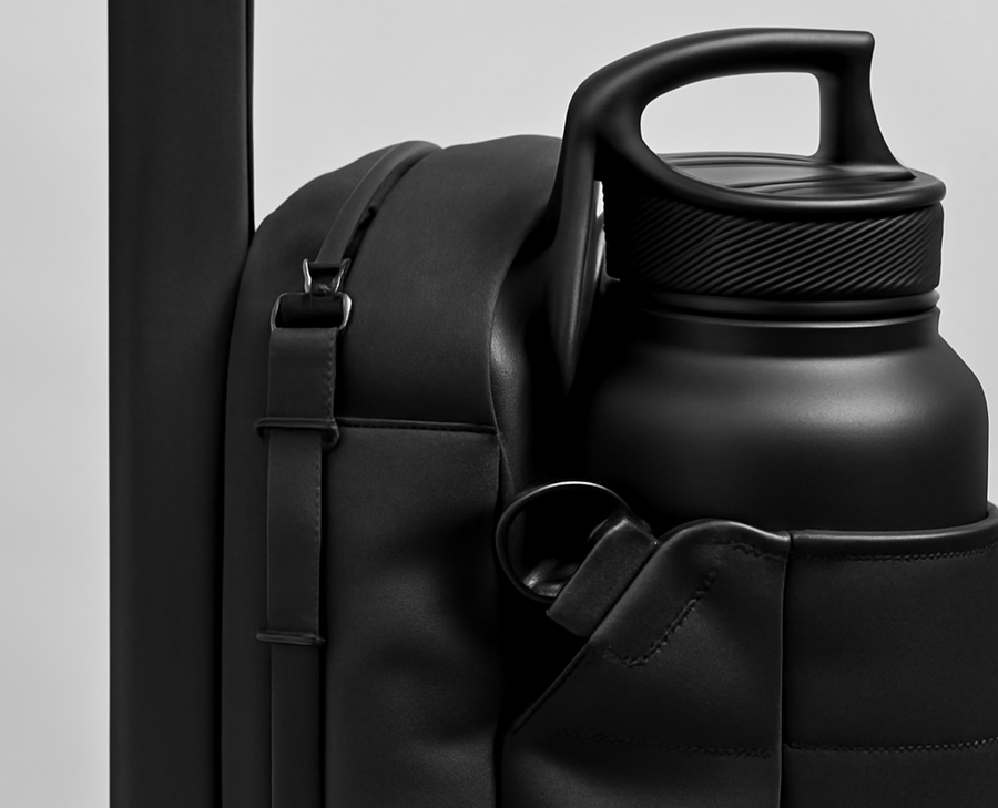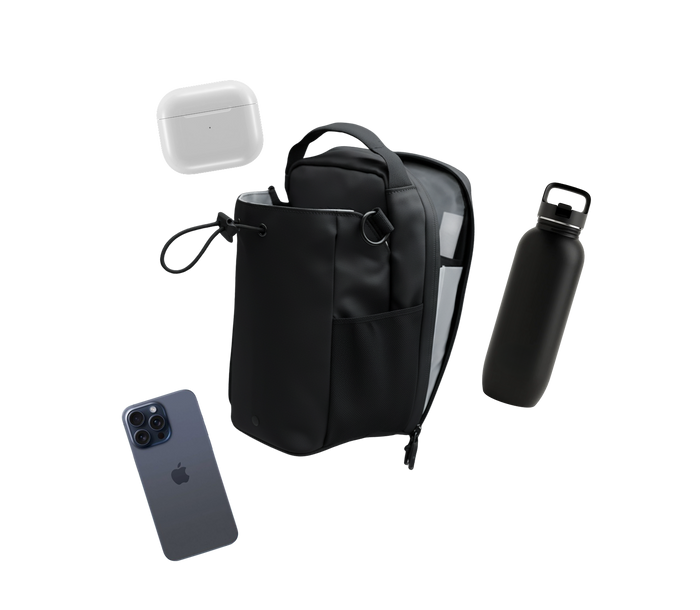 Le sac peut contenir une bouteille, une serviette, un téléphone, des clés et d’autres petits accessoires. Il est conçu pour garder vos affaires accessibles sans vous encombrer pendant vos séances.